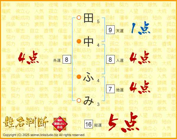 生活面を象徴する運勢です。外部から受ける影響力を表し、結婚運、家庭運や職場、環境への順応性を表します。総運から人運を引いた画数。姓や名が1文字の場合を除く。