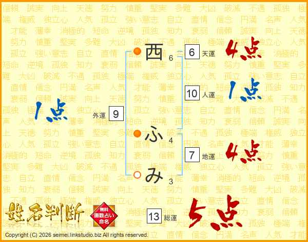 画数の奇数(○陽)と偶数(●陰)の配列で吉凶を占います。どちらかにかたよる名前は大凶名で避ける必要があります。画数の奇数偶数。