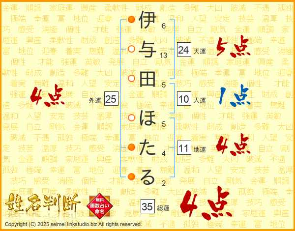 伊(6画)与(13画)田(5画) ほ(5画)た(4画)る(2画)
