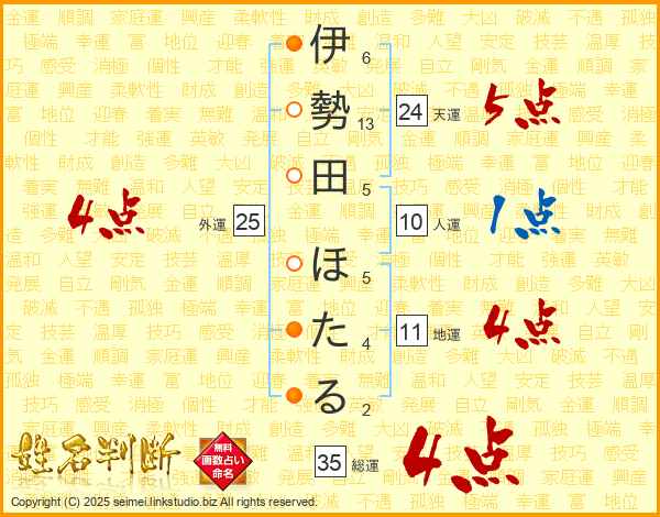 伊(6画)勢(13画)田(5画) ほ(5画)た(4画)る(2画)