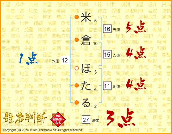 生活面を象徴する運勢です。外部から受ける影響力を表し、結婚運、家庭運や職場、環境への順応性を表します。総運から人運を引いた画数。姓や名が1文字の場合を除く。