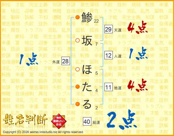 あなたの人生を表す1番重要な運勢です。生涯を通じて影響する総合運となり、主に50歳以降の晩年期に影響を及ぼします。苗字と名前の合計画数。