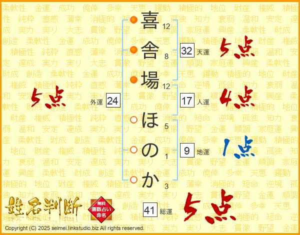 喜(12画)舎(8画)場(12画) ほ(5画)の(1画)か(3画)