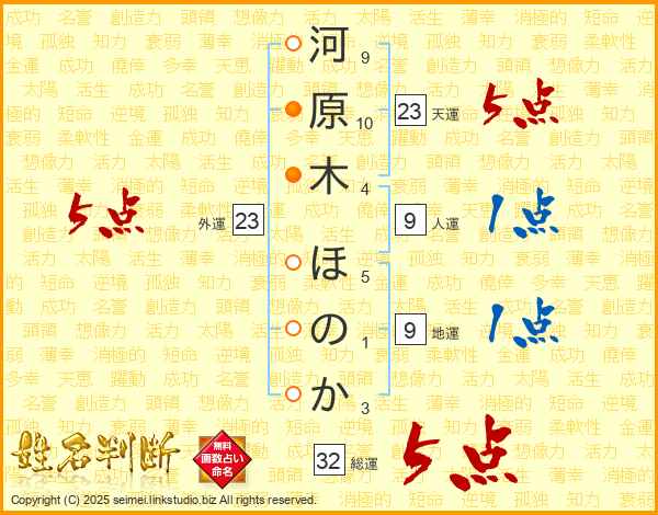 生活面を象徴する運勢です。外部から受ける影響力を表し、結婚運、家庭運や職場、環境への順応性を表します。総運から人運を引いた画数。姓や名が1文字の場合を除く。