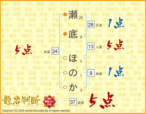 瀬(20画)底(8画) ほ(5画)の(1画)か(3画)