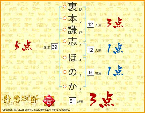 裏(13画)本(5画)謙(17画)志(7画) ほ(5画)の(1画)か(3画)