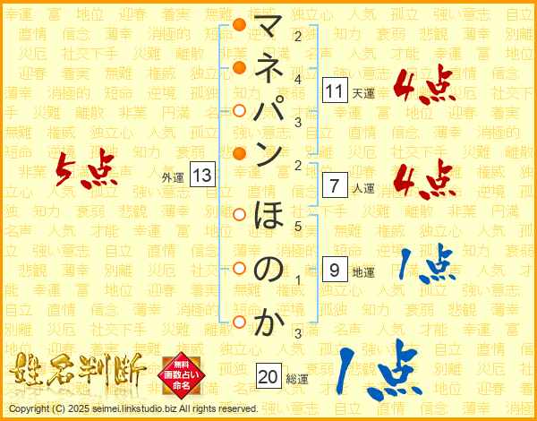 マ(2画)ネ(4画)パ(3画)ン(2画) ほ(5画)の(1画)か(3画)