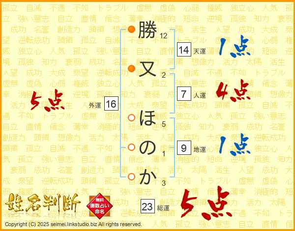 勝(12画)又(2画) ほ(5画)の(1画)か(3画)