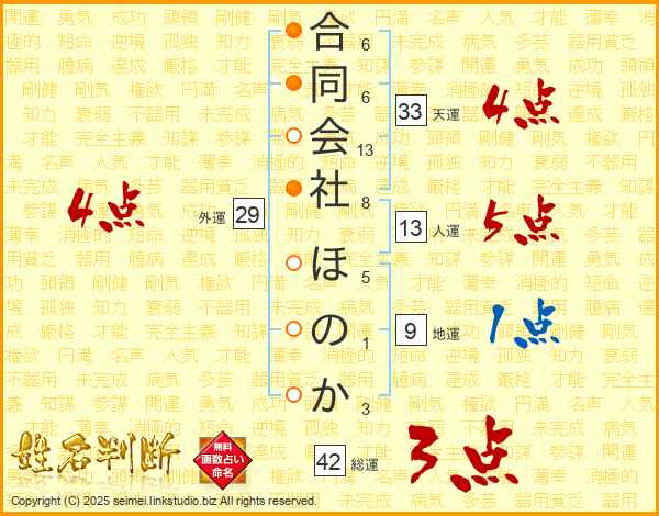合(6画)同(6画)会(13画)社(8画) ほ(5画)の(1画)か(3画)