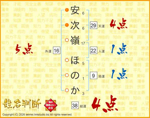 安(6画)次(6画)嶺(17画) ほ(5画)の(1画)か(3画)