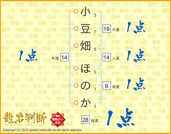 生活面を象徴する運勢です。外部から受ける影響力を表し、結婚運、家庭運や職場、環境への順応性を表します。総運から人運を引いた画数。姓や名が1文字の場合を除く。