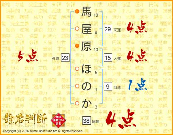 生活面を象徴する運勢です。外部から受ける影響力を表し、結婚運、家庭運や職場、環境への順応性を表します。総運から人運を引いた画数。姓や名が1文字の場合を除く。