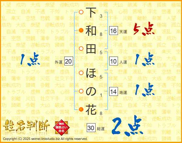 生活面を象徴する運勢です。外部から受ける影響力を表し、結婚運、家庭運や職場、環境への順応性を表します。総運から人運を引いた画数。姓や名が1文字の場合を除く。