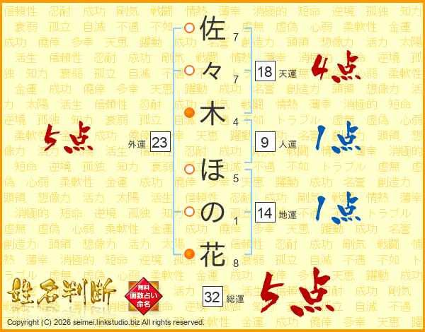 佐(7画)々(7画)木(4画) ほ(5画)の(1画)花(8画)