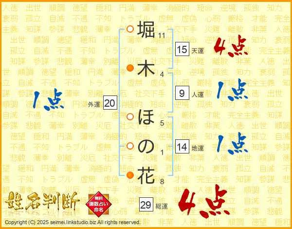 堀(11画)木(4画) ほ(5画)の(1画)花(8画)