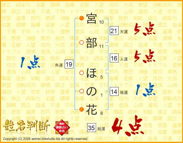 宮(10画)部(11画) ほ(5画)の(1画)花(8画)