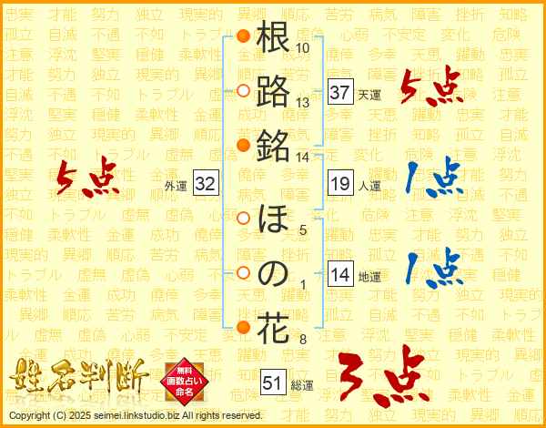 根(10画)路(13画)銘(14画) ほ(5画)の(1画)花(8画)