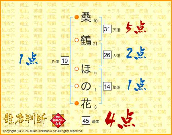 桑(10画)鶴(21画) ほ(5画)の(1画)花(8画)