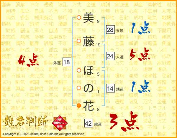 生活面を象徴する運勢です。外部から受ける影響力を表し、結婚運、家庭運や職場、環境への順応性を表します。総運から人運を引いた画数。姓や名が1文字の場合を除く。