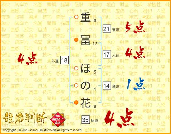 重(9画)冨(12画) ほ(5画)の(1画)花(8画)