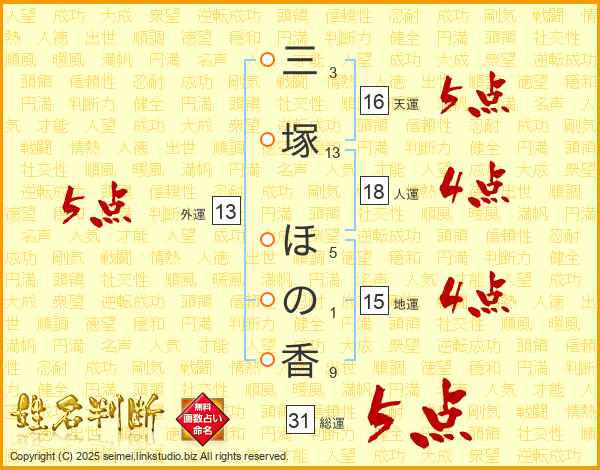 三(3画)塚(13画) ほ(5画)の(1画)香(9画)