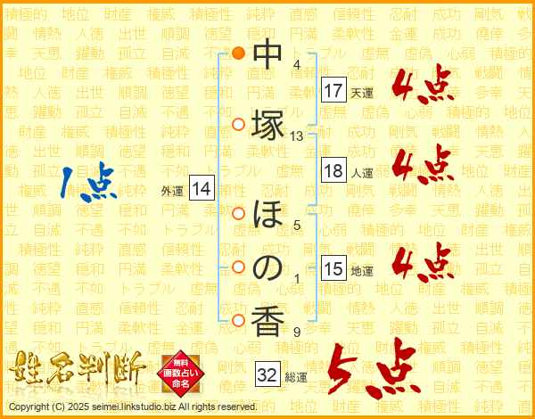 中(4画)塚(13画) ほ(5画)の(1画)香(9画)