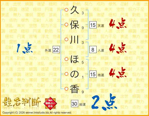 久(3画)保(9画)川(3画) ほ(5画)の(1画)香(9画)