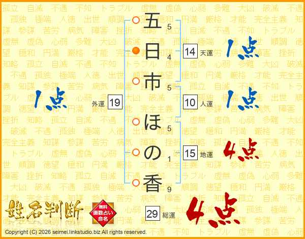 五(5画)日(4画)市(5画) ほ(5画)の(1画)香(9画)