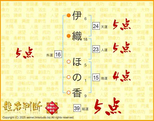 伊(6画)織(18画) ほ(5画)の(1画)香(9画)