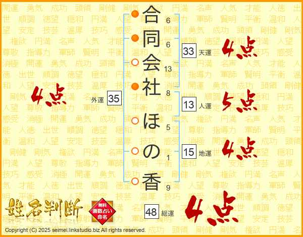 合(6画)同(6画)会(13画)社(8画) ほ(5画)の(1画)香(9画)