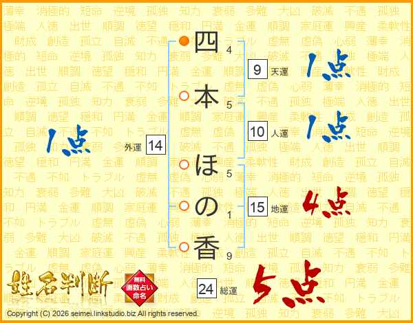 四(4画)本(5画) ほ(5画)の(1画)香(9画)