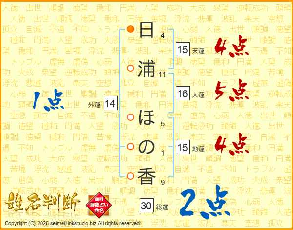 日(4画)浦(11画) ほ(5画)の(1画)香(9画)