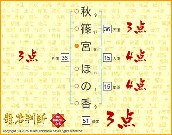 秋(9画)篠(17画)宮(10画) ほ(5画)の(1画)香(9画)