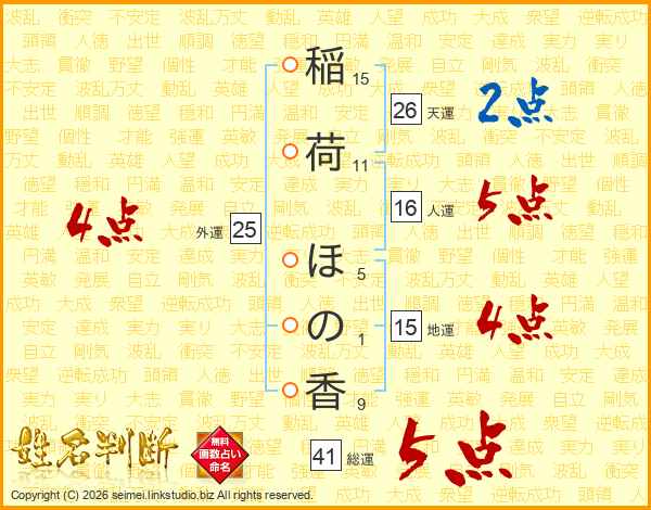 稲(15画)荷(11画) ほ(5画)の(1画)香(9画)