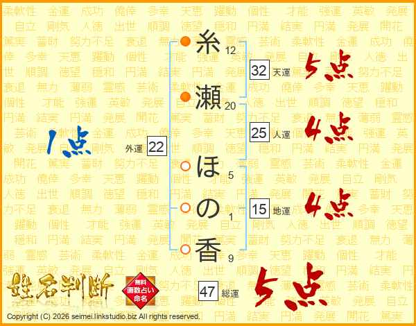 糸(12画)瀬(20画) ほ(5画)の(1画)香(9画)