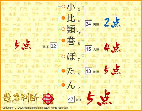 小(3画)比(4画)類(19画)巻(8画) ぼ(7画)た(4画)ん(2画)