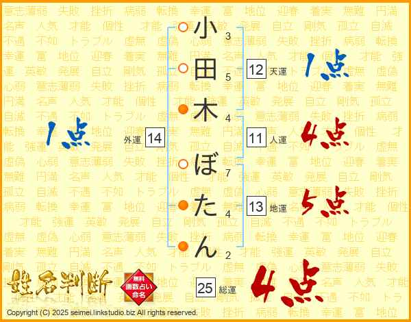生活面を象徴する運勢です。外部から受ける影響力を表し、結婚運、家庭運や職場、環境への順応性を表します。総運から人運を引いた画数。姓や名が1文字の場合を除く。
