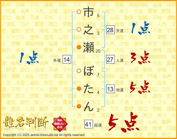 市(5画)之(3画)瀬(20画) ぼ(7画)た(4画)ん(2画)