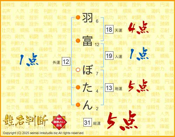 羽(6画)富(12画) ぼ(7画)た(4画)ん(2画)