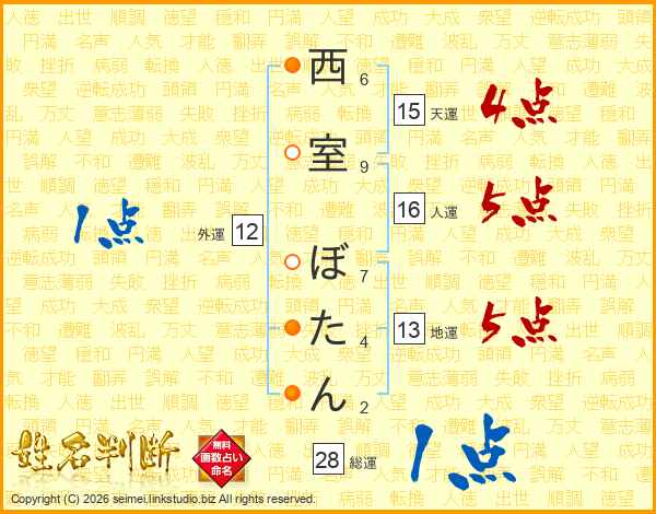 西(6画)室(9画) ぼ(7画)た(4画)ん(2画)