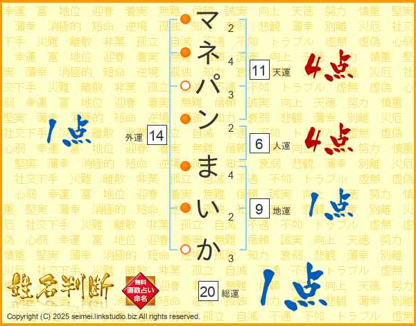 生活面を象徴する運勢です。外部から受ける影響力を表し、結婚運、家庭運や職場、環境への順応性を表します。総運から人運を引いた画数。姓や名が1文字の場合を除く。