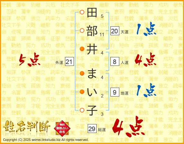 田(5画)部(11画)井(4画) ま(4画)い(2画)子(3画)