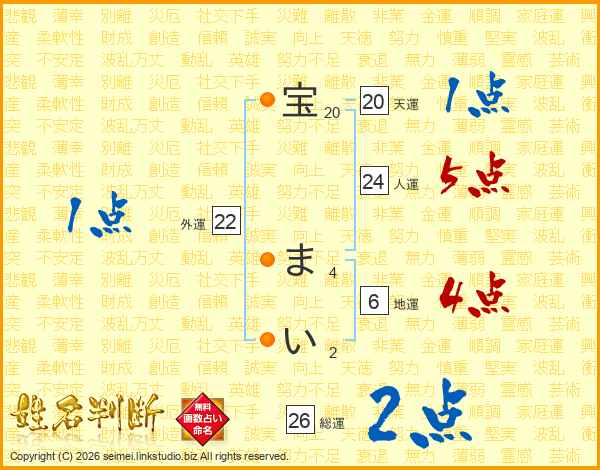 生活面を象徴する運勢です。外部から受ける影響力を表し、結婚運、家庭運や職場、環境への順応性を表します。総運から人運を引いた画数。姓や名が1文字の場合を除く。