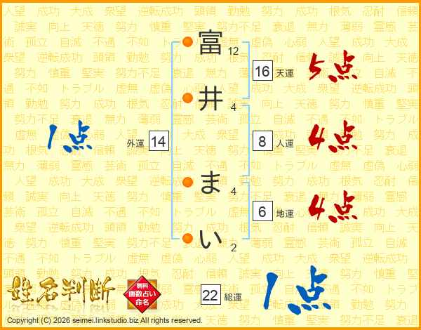 生活面を象徴する運勢です。外部から受ける影響力を表し、結婚運、家庭運や職場、環境への順応性を表します。総運から人運を引いた画数。姓や名が1文字の場合を除く。