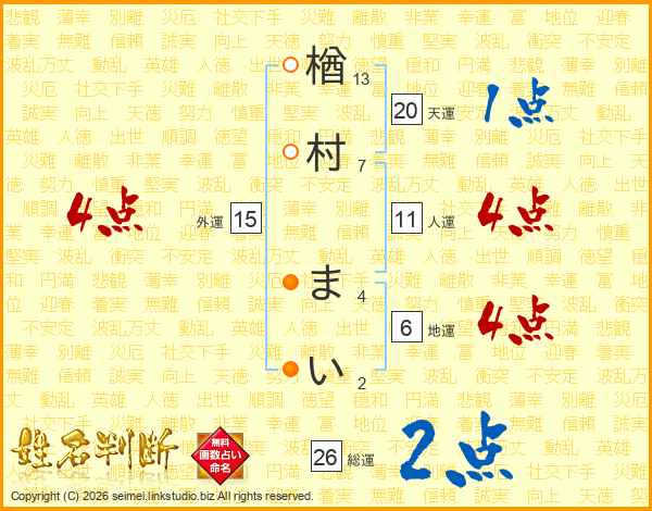 楢村まいさんの総運は26画の2点!