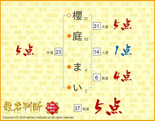 櫻(21画)庭(10画) ま(4画)い(2画)