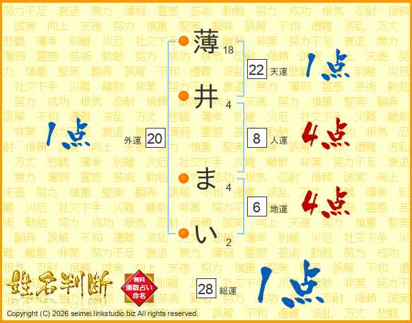 生活面を象徴する運勢です。外部から受ける影響力を表し、結婚運、家庭運や職場、環境への順応性を表します。総運から人運を引いた画数。姓や名が1文字の場合を除く。