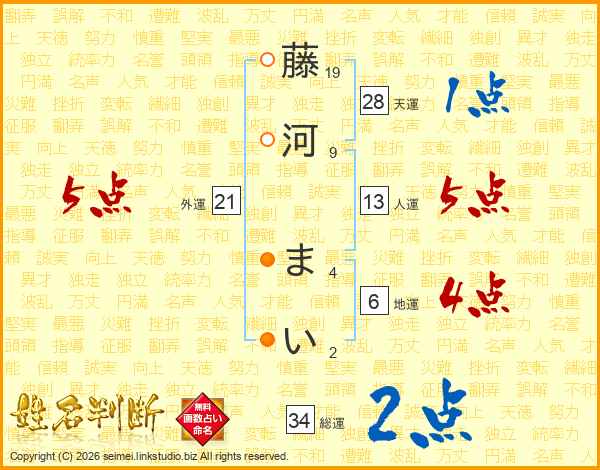あなたの人生を表す1番重要な運勢です。生涯を通じて影響する総合運となり、主に50歳以降の晩年期に影響を及ぼします。苗字と名前の合計画数。
