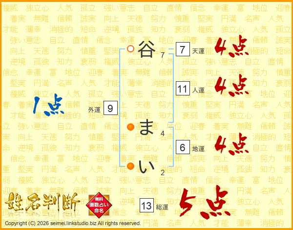 生活面を象徴する運勢です。外部から受ける影響力を表し、結婚運、家庭運や職場、環境への順応性を表します。総運から人運を引いた画数。姓や名が1文字の場合を除く。