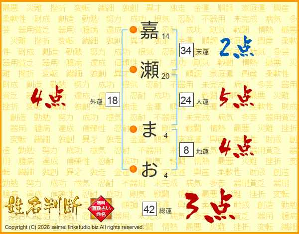 嘉(14画)瀬(20画) ま(4画)お(4画)